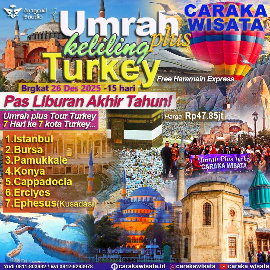 Manfaatkan momen liburan akhir tahun dengan perjalanan yang tak hanya menyegarkan jiwa, tapi juga memperkuat iman. Dalam program spesial ini, Anda dan keluarga berkesempatan melaksanakan ibadah Umroh dengan nyaman, sambil menikmati perjalanan wisata religi ke berbagai peninggalan bersejarah kejayaan Islam, khususnya masa kekhalifahan Turki Utsmani (Ottoman).
